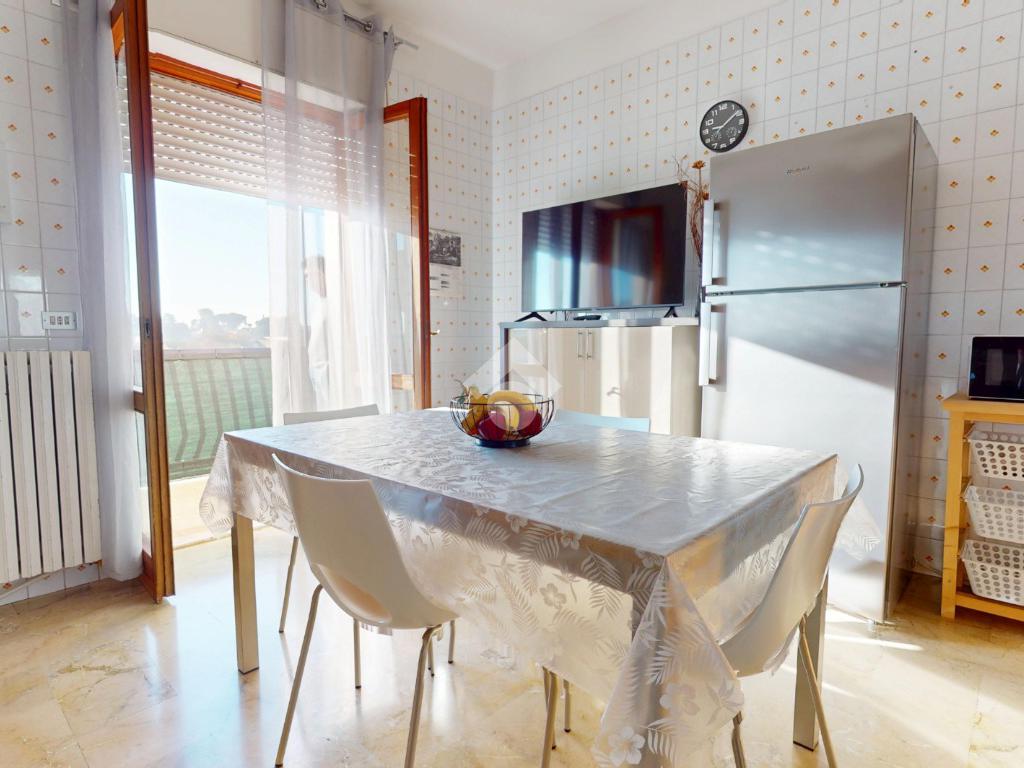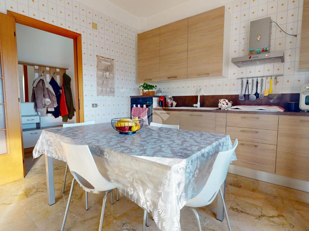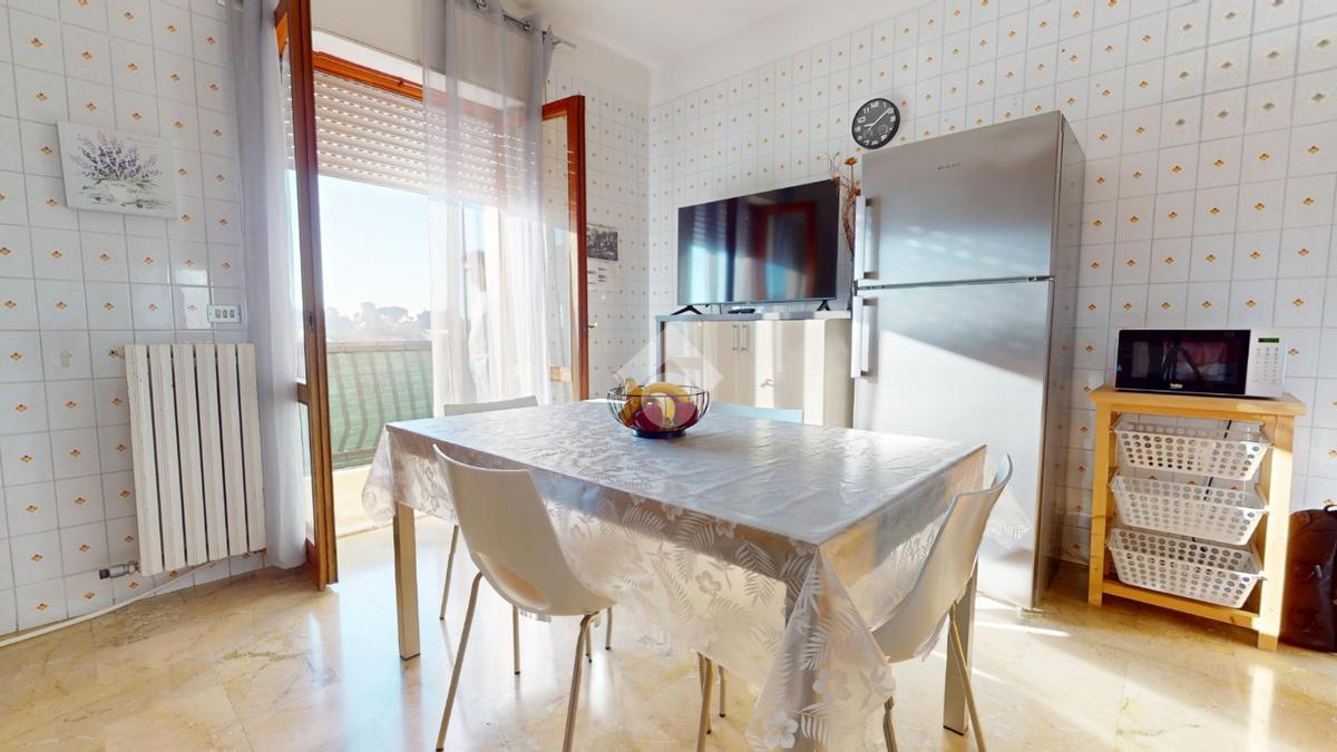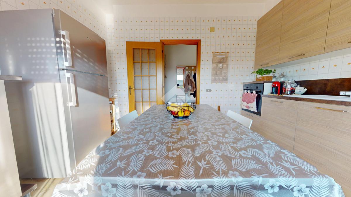 Il cuore pulsante dell'appartamento è la cucina conviviale, uno spazio ben organizzato e inondato di luce naturale grazie alla presenza di una grande porta finestra che si apre su un ampio balcone.