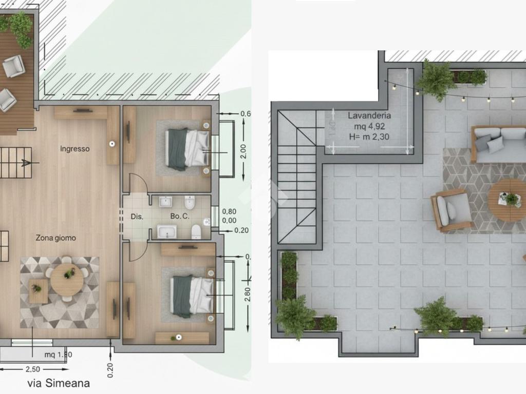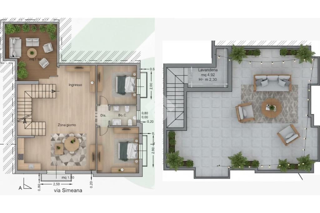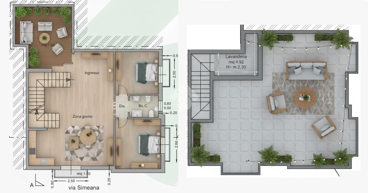 Con una superficie di 120 mq, questa abitazione offre un ampio open space con affaccio su via Simeana e sul terrazzino a livello, ideale per avere spazi esterni da vivere.