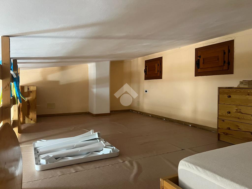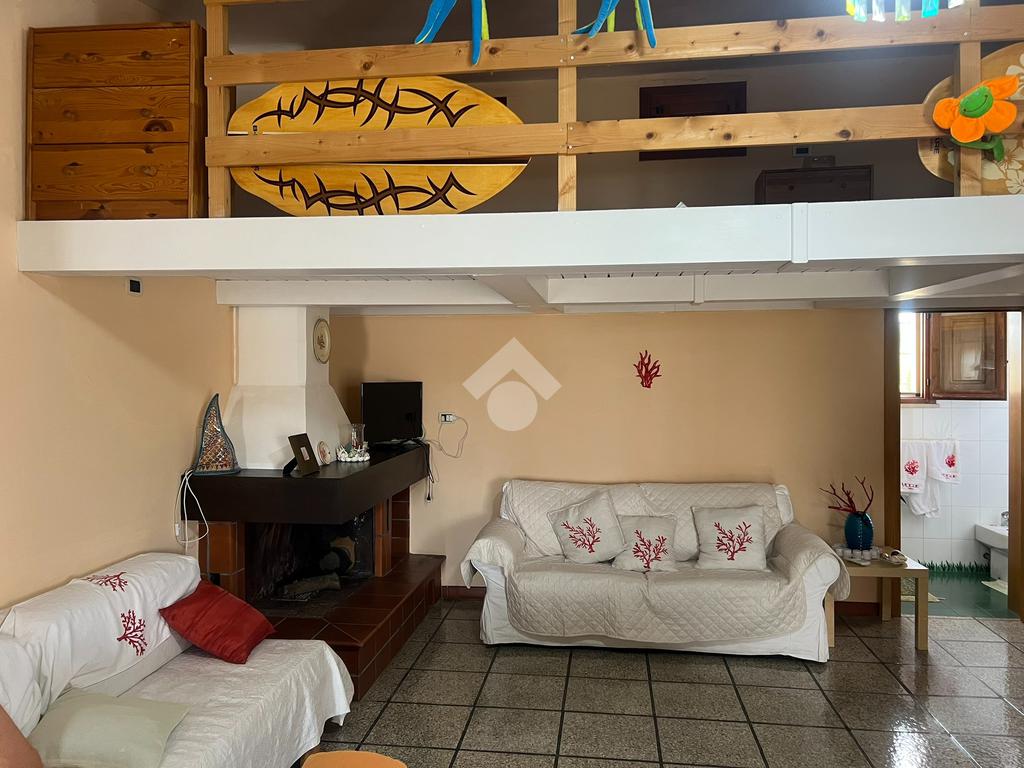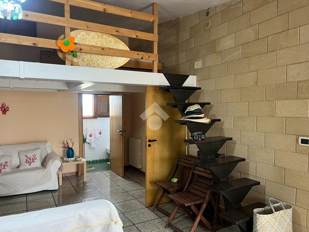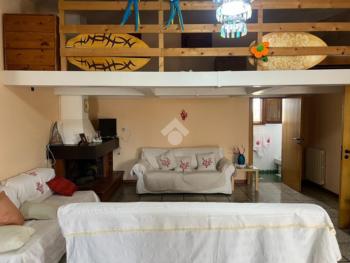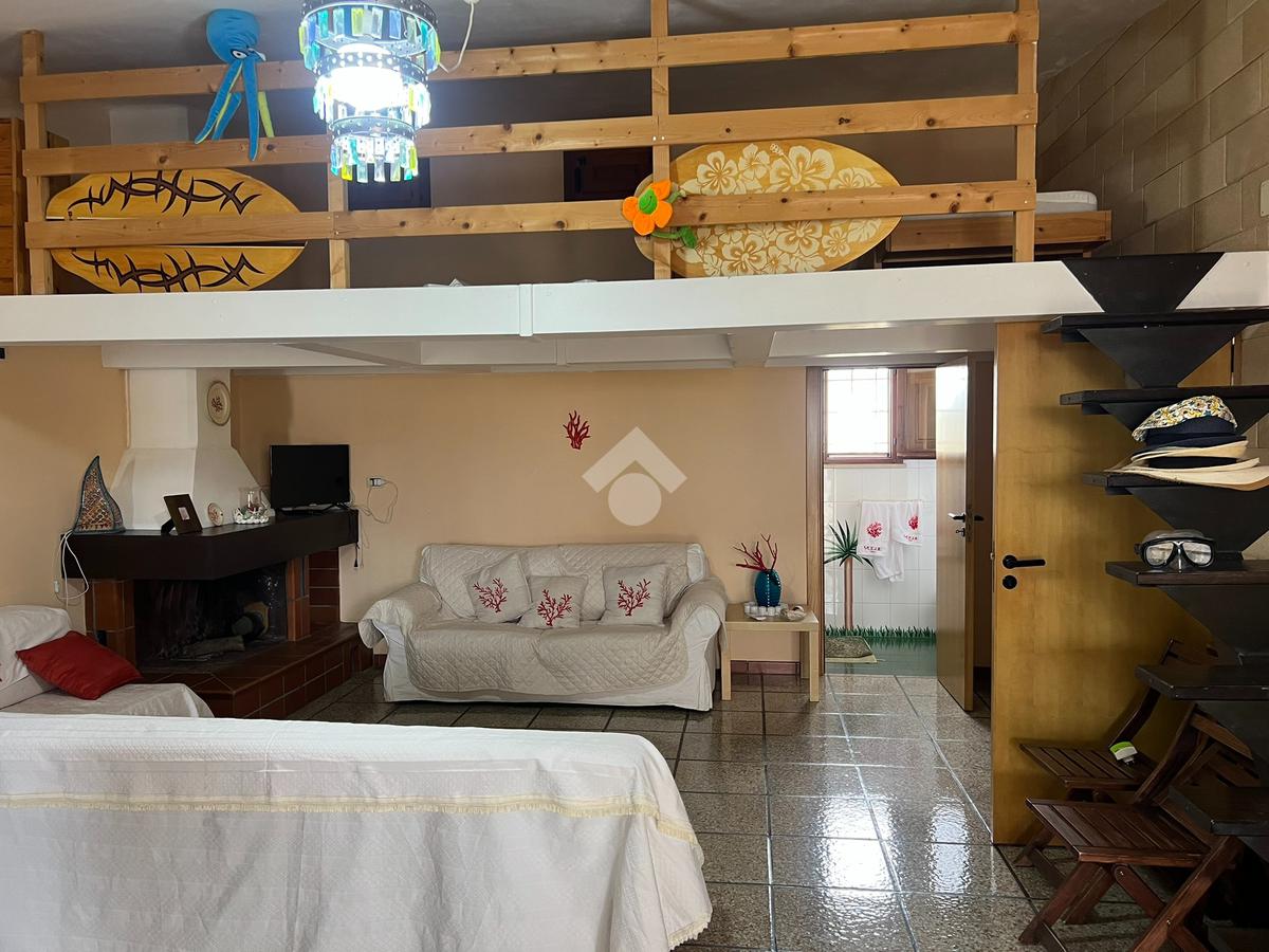 L’abitazione si apre su un grande open space soppalcato con caminetto, luminoso e ventilato, con adiacente cucinino e bagno in bisazza con doccia.